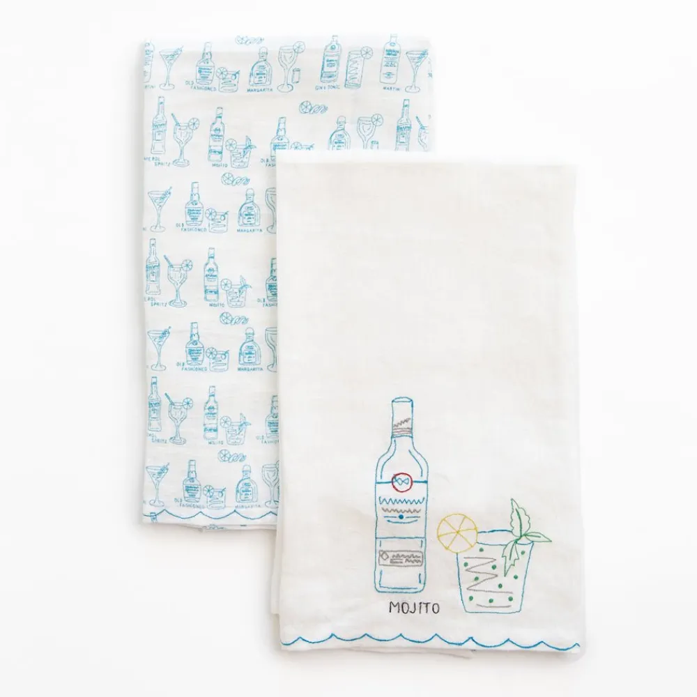 Sleek yet playful, our Mojito Tea Towels bring a touch of style to your kitchen or bar. This set features two elegant linen towels—one with an embroidered rum bottle and a glass decorated with citrus and mint, and the other printed with a variety of refreshing blue cocktail motifs. Refined scalloped edge detailing adds a finishing touch.
