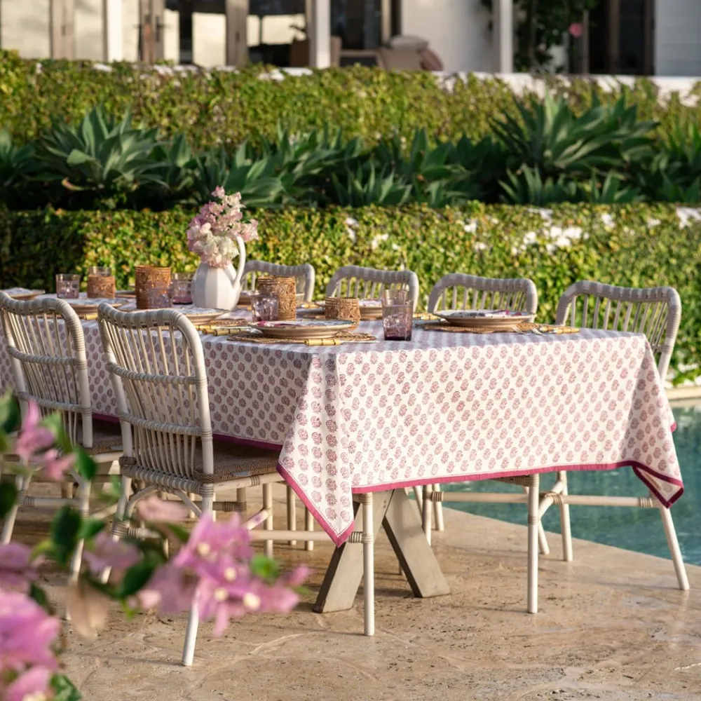 Transform your dining experience with the Anika Fuchsia Tablecloth. Hand-crafted with precision, this stunning tablecloth showcases a delicate hand block-printed floral design. Its elegant yet simple pattern brings a sense of refinement to any table setting, elevating it for both casual gatherings and formal occasions.