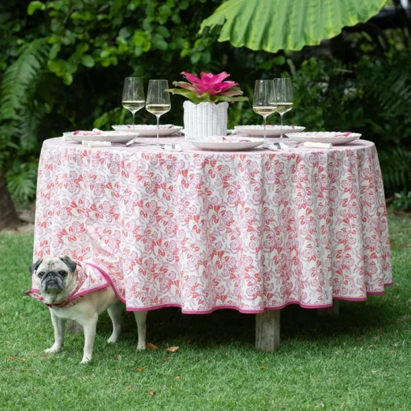 Elevate your dining experience with the Gardenia Vine Berry Tablecloth, a hand block-printed work of art. Its elegant fl…