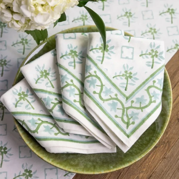 The delicate floral pattern from these tiles, now hand block printed in soothing Palladian Blue and Soft Sage, adorns these napkins. Ideal for both casual and formal gatherings, adding a touch of elegance to any setting.