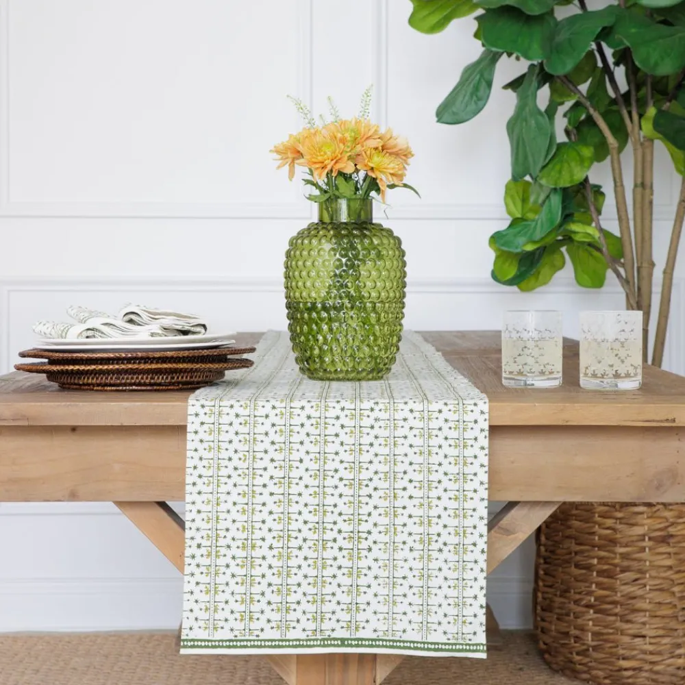 This India Hicks Palm Avenue Table Runner was inspired by India’s life on Harbour Island. When she first moved to the Bahamas, her family planted an avenue of baby palm trees, now several years later they lay up the family dining table under the shade of these tall majestic trees. The beautiful palm tree pattern is now available in an iconic hunter green hue, laying the perfect foundation for any occasion, from al fresco dining to holiday gatherings.