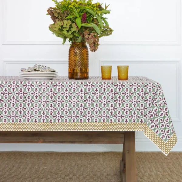 Set the stage for memorable meals with our Fleur de Lis Antique Jade Tablecloth. The eye-catching Fleur de Lis pattern in jade green hues, surrounded by a yellow geometric border, instantly enhances any table setting. This hand block printed tablecloth is crafted from 100% cotton for a soft, breathable feel. Whether for everyday dining or festive occasions, this elegant tablecloth creates a warm and inviting atmosphere.