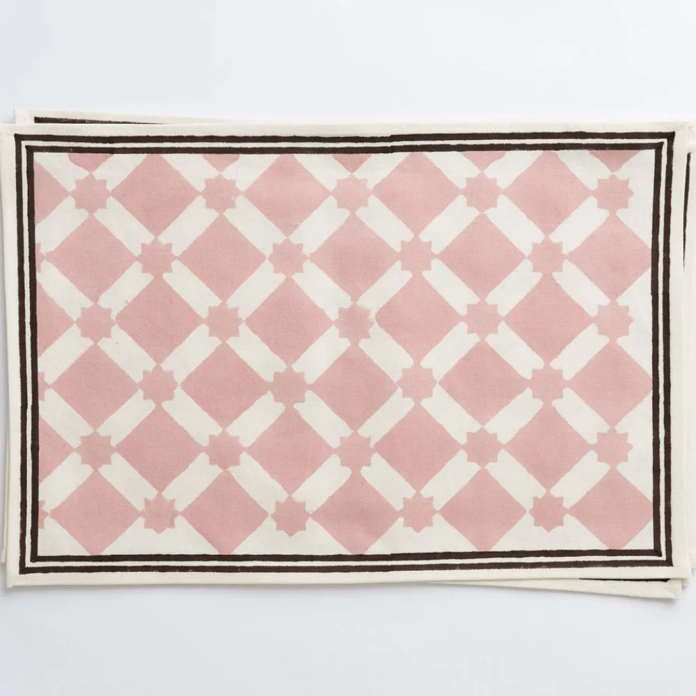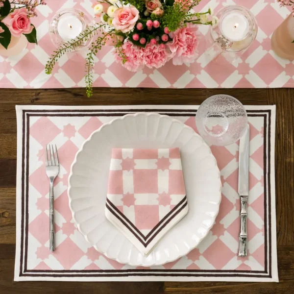 Our Latticework Blush Placemats were designed to encapsulate the whimsical essence of wandering through narrow streets adorned with picket fences, quaint wooden homes painted in soft, pretty hues, and a mesmerizing labyrinth of latticework.