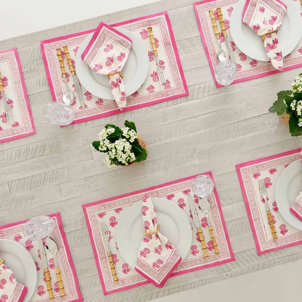 Our latest exclusive rose pink and white print is refreshing yet cool. traditional and exotic, all at the same time. Cheer up your table with the bright pink and white updated Indian motif placemat, and pair with matching napkins and table runners. A perfect gift for your mom, best friend, neighbor…oh, and for you!