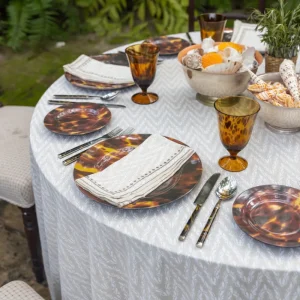 In the olden days, what we now see as the gold shoulder braid on high-ranking officers—called an aiguillette (pronounced “egg-wee-let”)—was originally just rope and pegs. It was carried on the shoulder by a knight’s aide-de-camp, ready to tether the knight’s horse. The ornamental braided cords with decorative metal tips are now worn on uniforms by officers to distinguish special and senior appointments, but wouldn’t it be fun if they were still used to tether the occasional horse? This hand block printed Chevron patterned tablecloth draws its inspiration from those striking gold braids.