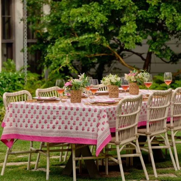 Our latest exclusive rose pink and white print is refreshing yet cool. Traditional and exotic, all at the same time. Cheer up your table with this bright pink and white updated Indian motif tablecloth, and pair with matching napkins and placemats. A perfect gift for your mom, best friend, neighbor…oh, and for you! Available in 4 sizes.