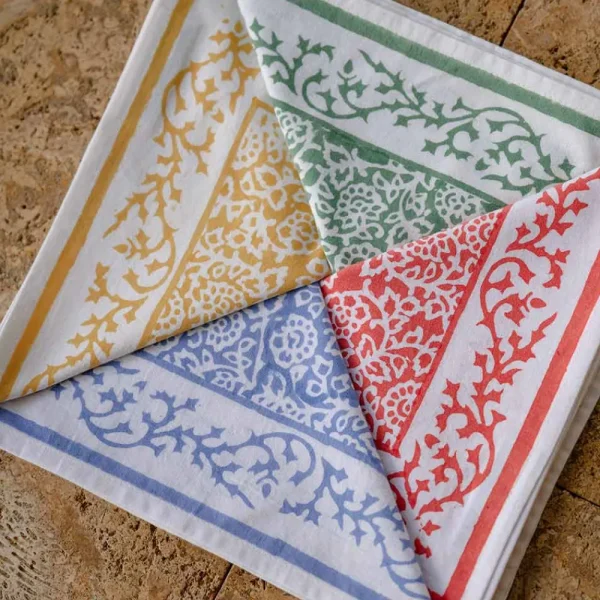 This updated traditional classic yellow and white hand block printed Tapestry Marigold Napkin was designed to symbolize the weaving of stories that are shared during meals. Explore conversations with family, friends, and guests that remind us of the beauty of details and encapsulates the tapestry of your entertaining.