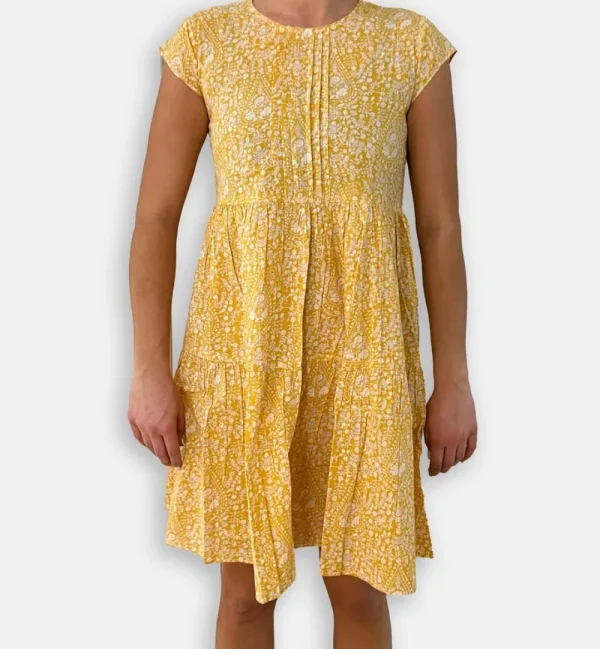 Spark joy with this flowy yellow dress featuring a stunning paisley print. The cap sleeves add a touch of elegance while the pintuck detailing adds texture. Perfect for any occasion, this dress will have you feeling confident and stylish.