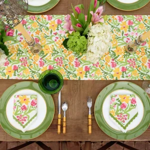 Classic modern retro floral table runner. Pink tulips, yellow daffodils, and lime green leaves adorn this modern classic collection of table linens and kitchen accessories. Fresh from the garden our 70s Flower print table runner will take you back to the 1970s with a retro feel, cheering up your table and home. 100% cotton and handmade in India by skilled artisans for Pomegranate. Table Runner shown.