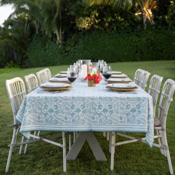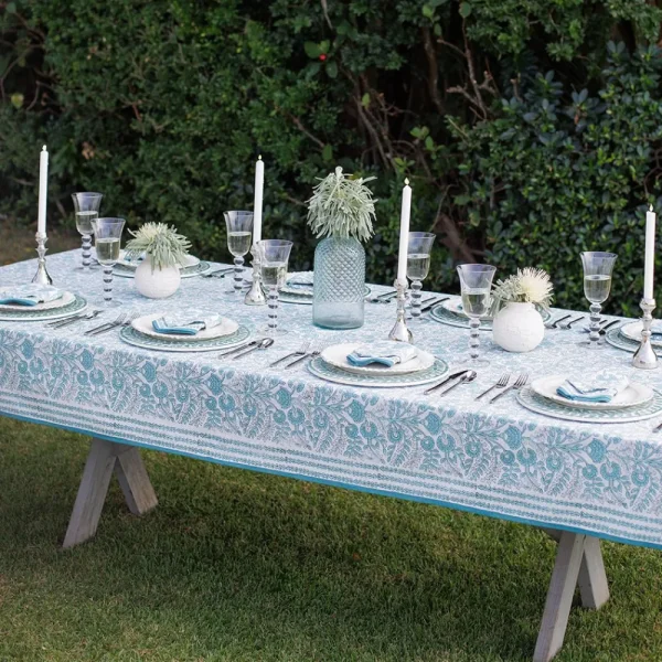 Create a picturesque dining setting with the Floral Trellis Aqua Tablecloth. This exquisite tablecloth features a hand block printed design of intricate floral patterns in soothing aqua blue hues, bringing a sense of calm and sophistication to your meals. Made from 100% cotton, it is not only beautiful but also durable and machine washable, ensuring it remains a centerpiece of your dining decor for years to come.