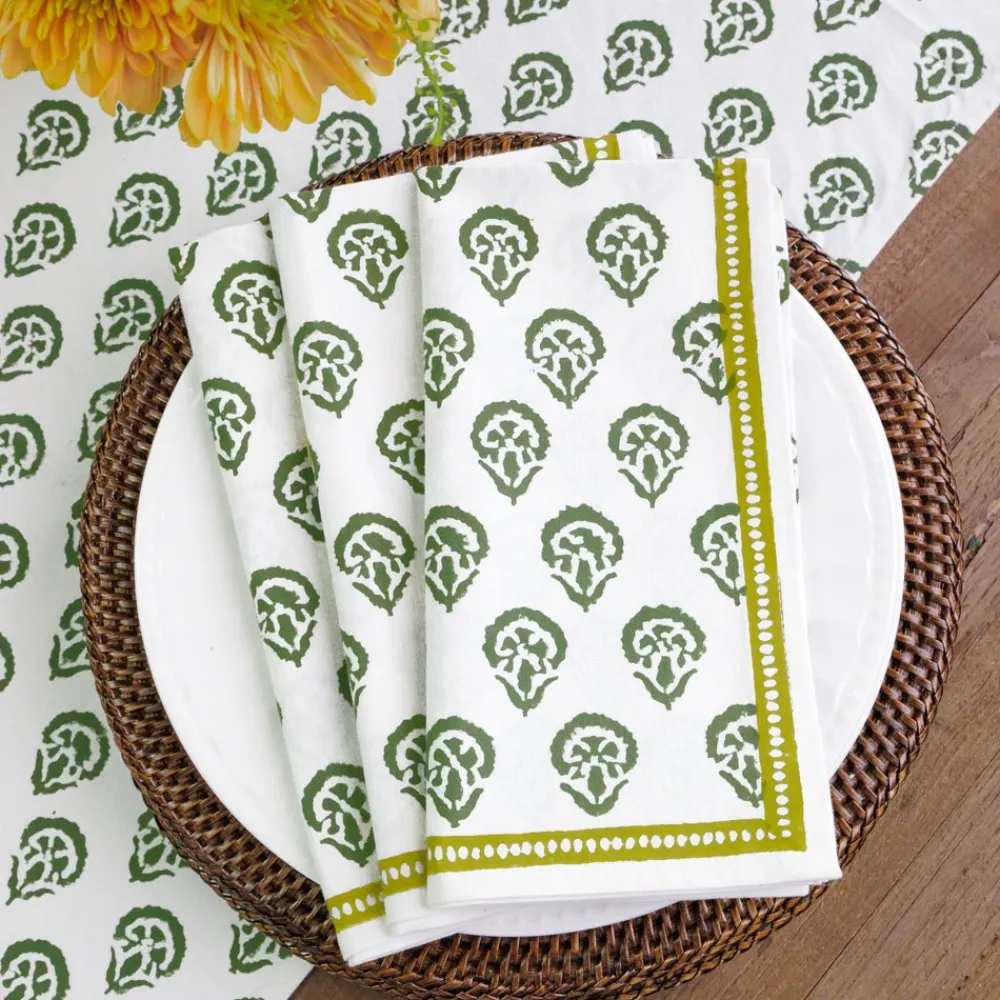 Set the table with the India Hicks Home Set of 4 Napkins, featuring a hunter green motif with a bold chartreuse border. 100% cotton and hand block printed exclusively for India Hicks Home x Pomegranate.