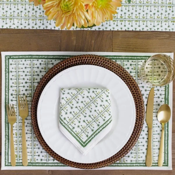 These placemats were inspired by India’s life on Harbour Island. When she first moved to the Bahamas, her family planted an avenue of baby palm trees, now several years later they lay up the family dining table under the shade of these tall majestic trees. The beautiful palm tree pattern is now available in an iconic hunter green hue, laying the perfect foundation for any occasion, from al fresco dining to holiday gatherings.