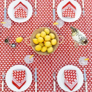 Complete your dining ensemble with our Pom Buti Red Napkins. These charming accessories are the perfect finishing touch, adding a vibrant pop of color and a touch of elegance to your table setting. Their rich red hue and intricate white floral pattern combine to elevate your dining experience to new heights of sophistication. Versatile all year round, these napkins are the ideal canvas for mix and matching with other colors and patterns, allowing you to tailor your table decor to suit any occasion or season. Whether you’re hosting a festive holiday dinner or an intimate gathering, let the Pom Buti Red Floral Napkins be the versatile and stylish choice that ties your table setting together with finesse.