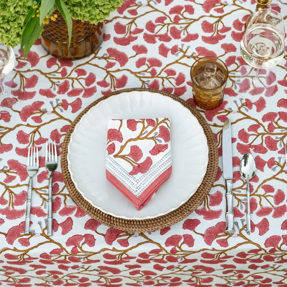 Elevate your dining experience with our Ginkgo Coral Napkin set. These hand block printed napkins feature a delicate ginkgo leaf motif in soft coral hues, inspired by nature’s timeless beauty. Crafted from 100% cotton, these napkins are not only beautiful but practical—durable enough for daily use and easy to care for.