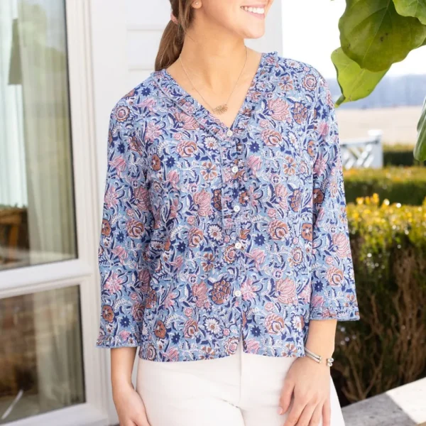Introducing our Taj Floral Blue Flange Button Blouse! A swirling floral design in a combination of light blue, navy and mauvey pinks make pairing a breeze. We’ve shown it with white pants – a sure win. As always we’ve provided plenty of details: ruffle flange trim, pretty mother-of pearl buttons and a flattering neckline.