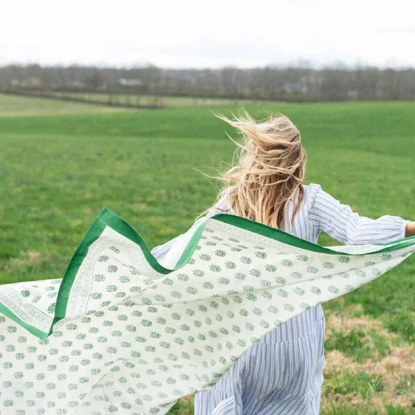 Our latest exclusive green and white print is refreshing yet cool, traditional and exotic, all at the same time. Cheer up your table with our new block printed chardonnay print, a refreshing updated Indian motif, exclusively designed in collaboration with Angela Vineyards – the award winning Portland, Oregon winery. Shouldn’t everyone match their tablecloth with their wine?