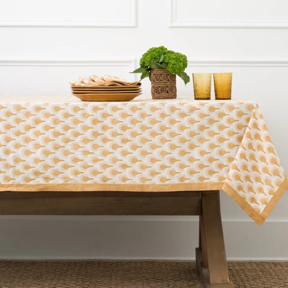 Add a touch of bohemian flair to your dining space with our Geo Feather Ochre Tablecloth. Hand block printed with a char…