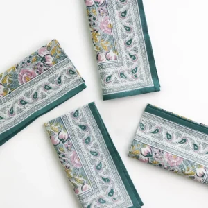 Enhance your dining experience with the subtle charm of our Pomegranate Garden Teal & Lilac Napkins. This set of four napkins displays a floral pattern in shades of lilac and teal, bordered by a delicate paisley design. Crafted from soft, hand block printed cotton, these napkins combine durability with elegant design, perfect for daily use or special occasions.