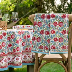 Cool and chic, our bohemian floral print in turquoise and cherry hues is refreshing and unique, traditional and exotic, all at the same time. Elevate your kitchen with the our latest recolor of one of our favorite prints in turquoise, cherry red, pink and aqua cotton hand block printed tea towels, and pair with matching apron and oven mitt sets. A lovely updated kitchen textile to add a pop of color to your everyday. A great gift for your cooking enthusiast!