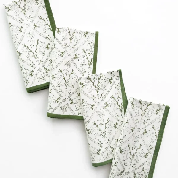 When India’s daughter, Domino, was small, the two would spend endless hours wandering down to the ocean, collecting strange and wonderful looking bits of sea fern that washed up around their feet and placing these treasures into patterns. These napkins tell a story, harking back to those cherished moments they spent exploring the shoreline together. Now reimagined in a beautiful fall green, this set of four 100% cotton Sea Ferns & Domino cloth napkin set is a lovely addition to any table setting.